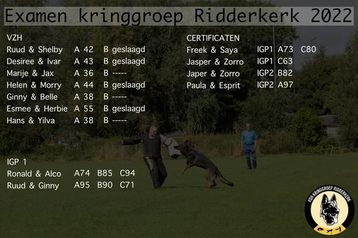 Zondag 11 september hebben we examens gehad op de club en op het speurveld. Bij het speuren hebben Paula en Esprit de hoogste punten, IGP2 met 97 punten! Daar zijn we heel trots op.
